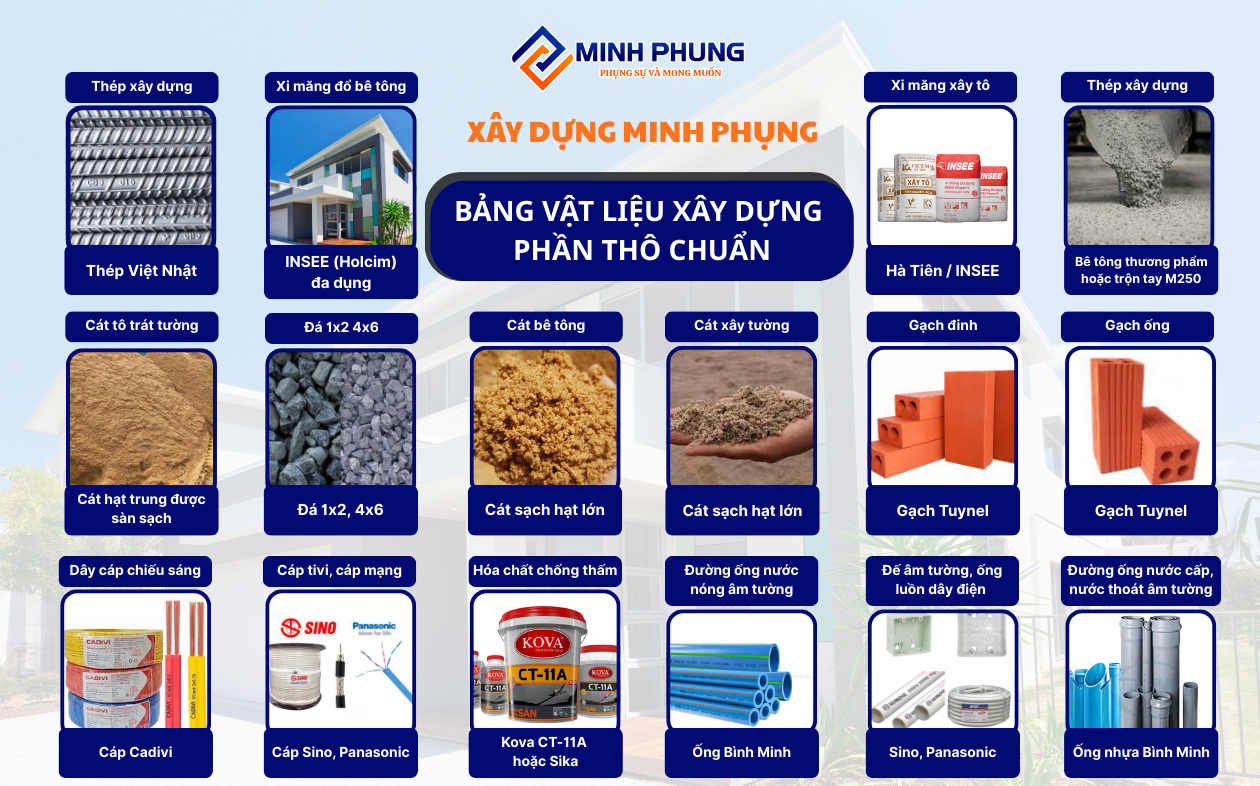 Tại Minh Phụng, vật tư không chỉ được chọn theo tiêu chuẩn chất lượng mà còn được sàng lọc kỹ lưỡng để phù hợp với đặc thù đất nền yếu và độ ẩm cao ở khu vực Bình Thủy, giúp công trình đạt độ bền vững tối ưu.