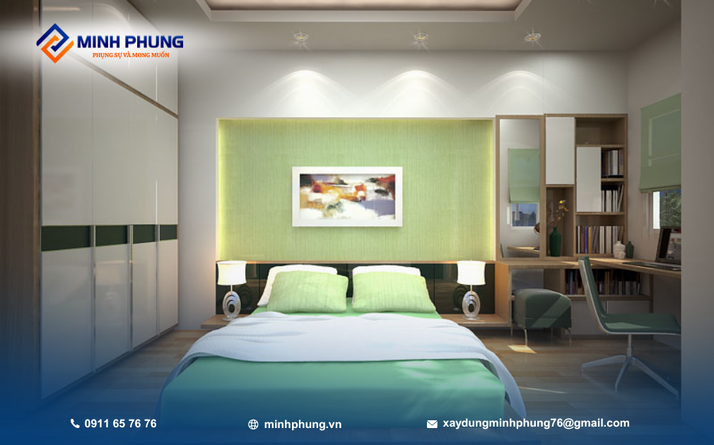 - Ánh sáng và màu sắc: Ánh sáng trong phòng ngủ nên dịu nhẹ, tránh ánh sáng quá mạnh. Màu sơn nên là những gam màu trung tính, nhẹ nhàng như kem, xanh dương nhạt, be để tạo không gian thư giãn, dễ chịu.
