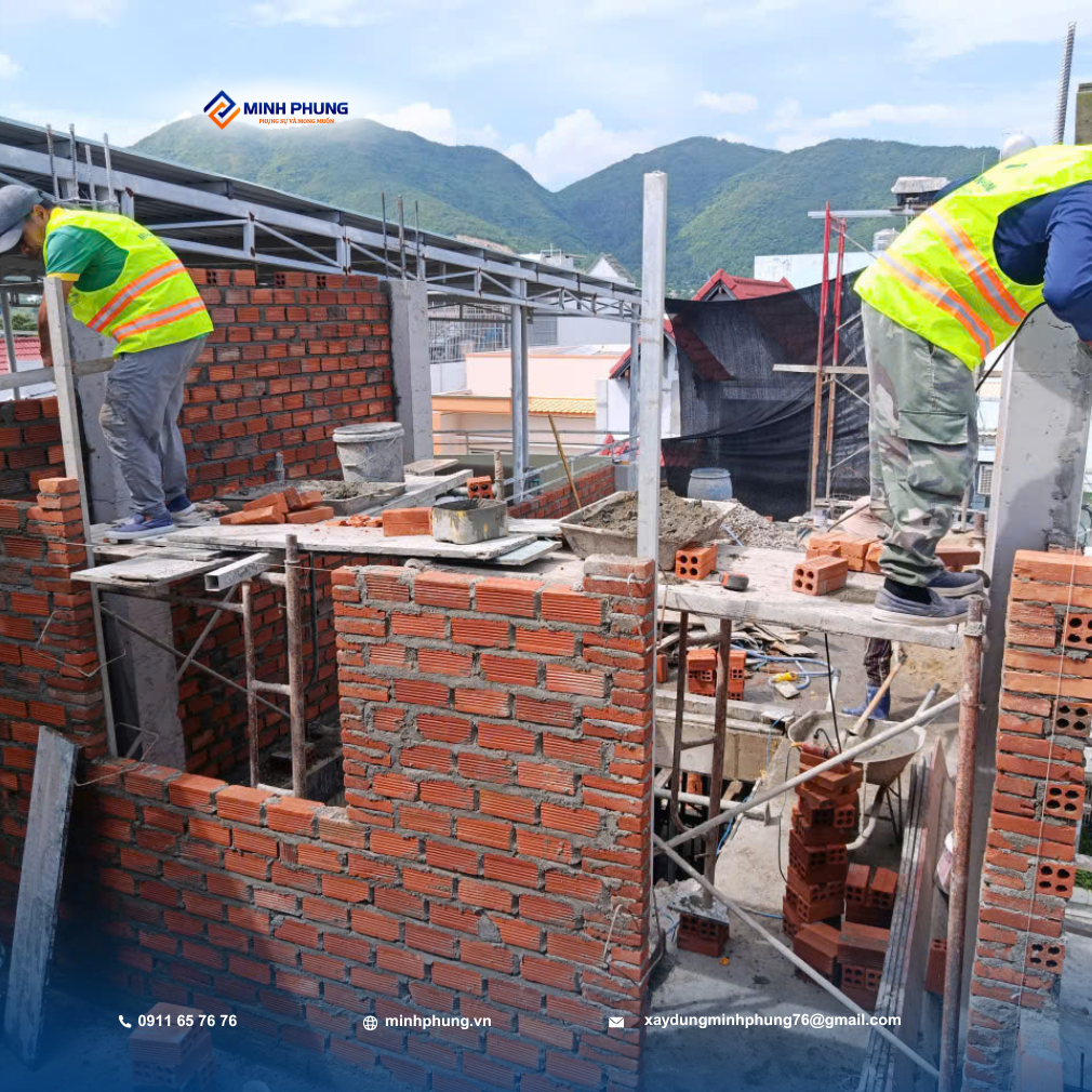 Minh Phụng – công ty xây dựng nhà đẹp chuyên nghiệp, mở rộng dịch vụ xây nhà uy tín khắp các tỉnh thành – đang tích cực triển khai dự án Xây nhà trọn gói Chị Linh tại Nha Trang. Công trình hiện đang bước vào giai đoạn xây tường sân thượng và tum mái, là bước cuối cùng của phần thô, chuẩn bị cho quá trình hoàn thiện kiến trúc.