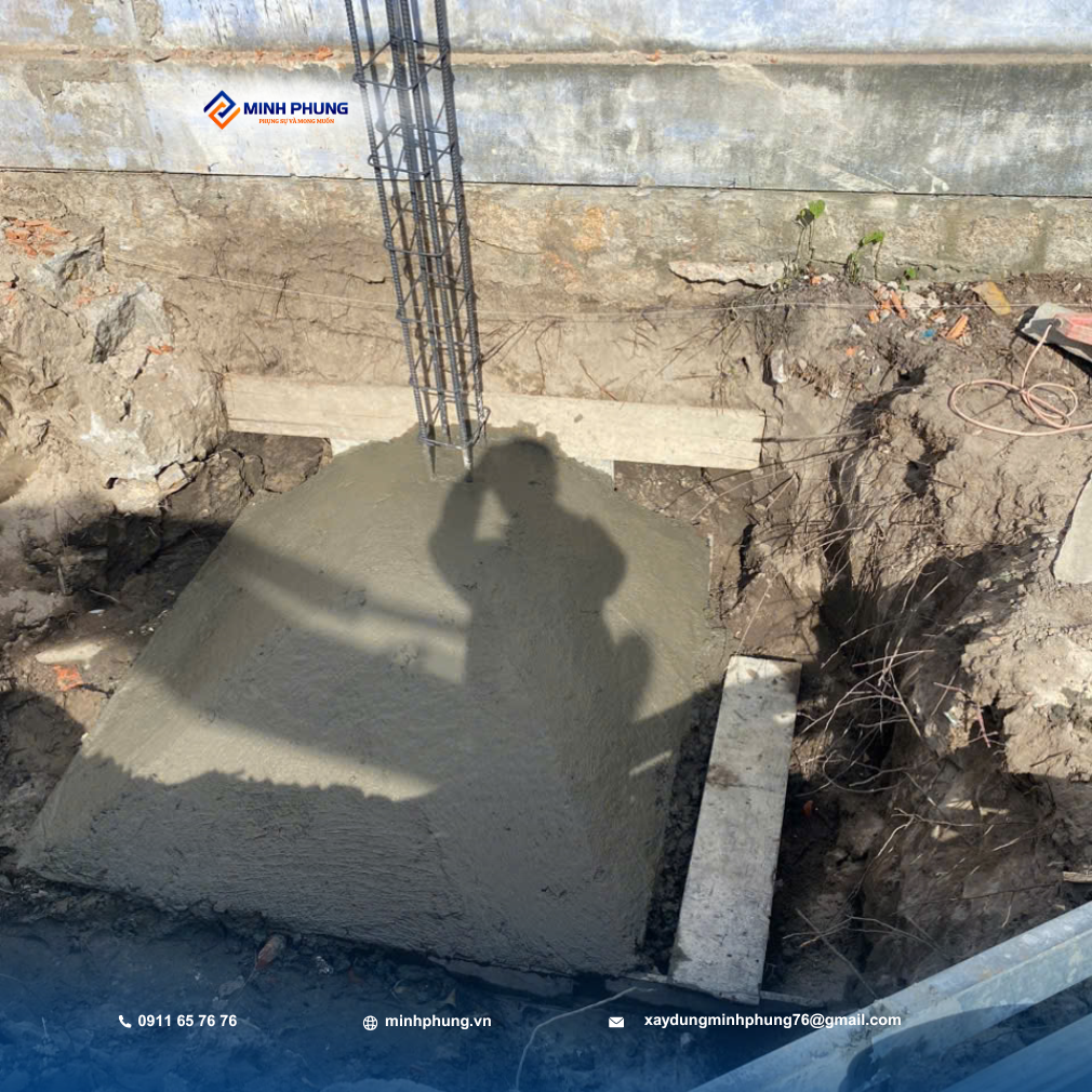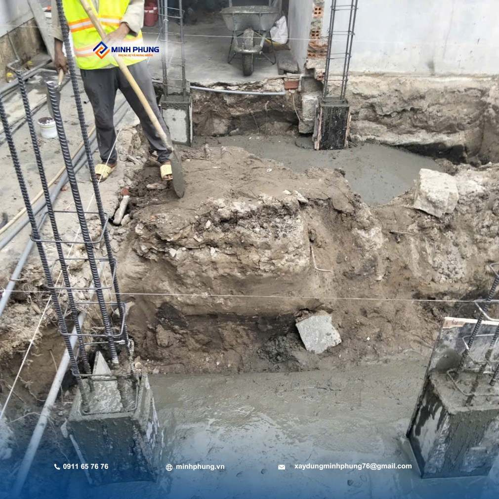 - Đổ bê tông: Sau khi cốt thép và cốt pha đã hoàn chỉnh, bê tông chất lượng cao được đổ vào. Công đoạn này được thực hiện cẩn thận, đảm bảo bê tông lấp đầy mọi ngóc ngách, không bị rỗng ruột, tạo nên một khối bê tông đặc, chắc, kết nối chặt chẽ các thành phần của móng và cột.