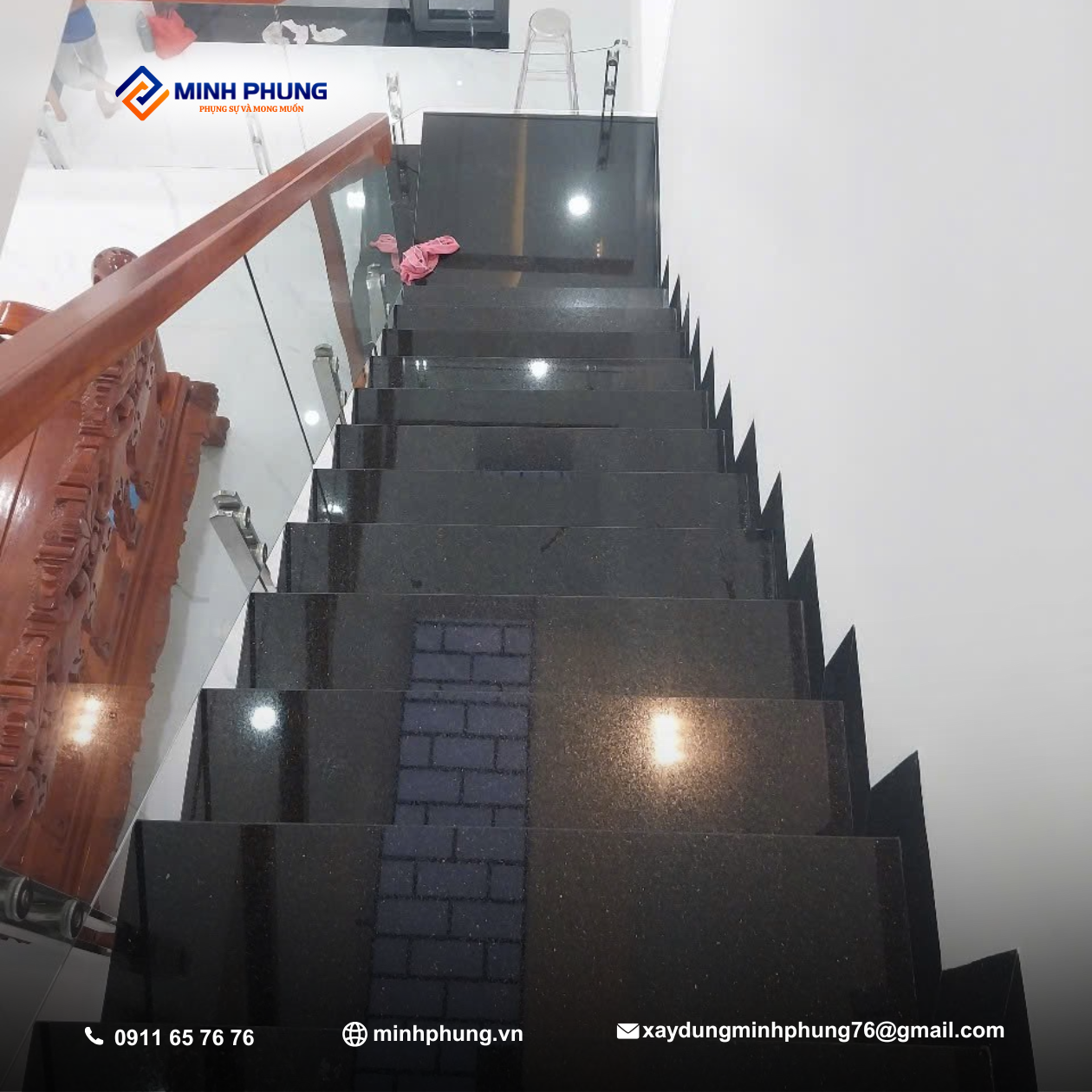 - Cầu Thang Sang Trọng: Từng bậc cầu thang được ốp đá đen Granite cao cấp, kết hợp với lan can kính cường lực, không chỉ an toàn mà còn là chi tiết nâng tầm đẳng cấp cho không gian sinh hoạt chung.