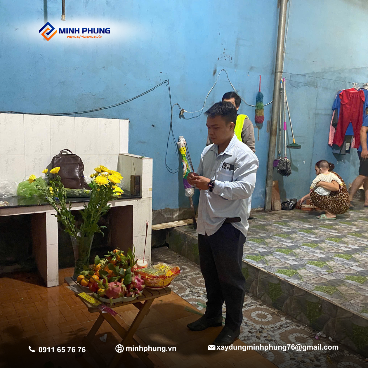 Ánh nắng ban mai của ngày 30/10/2025 rọi xuống, chứng kiến khoảnh khắc gia đình Cô Phượng cùng đội ngũ Minh Phụng thực hiện nghi thức cúng bái trang trọng. Đây không chỉ là sự khởi đầu của một công trình, mà còn là khởi nguồn của sự an khang và thịnh vượng.