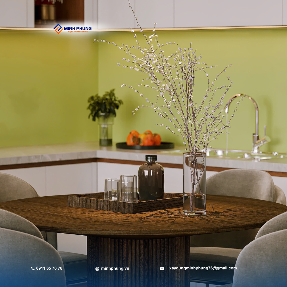 • Phòng Bếp & Ăn: Bàn ăn tròn ấm cúng, khu bếp sạch sẽ với màu sắc tươi mới, tạo sự kết nối cho gia đình.