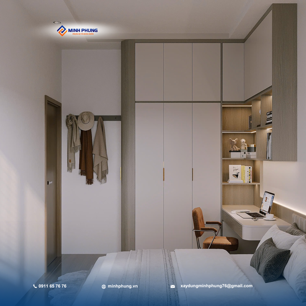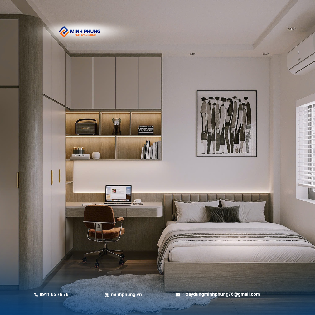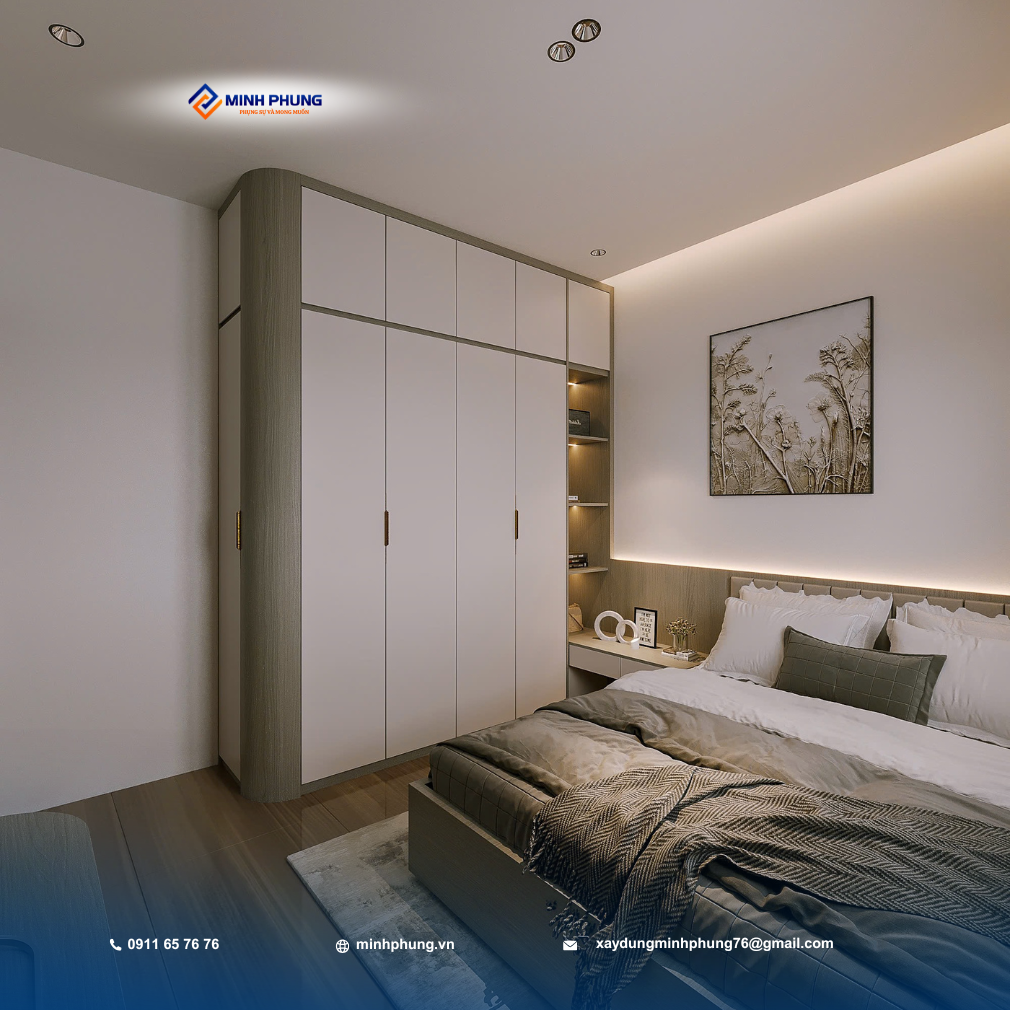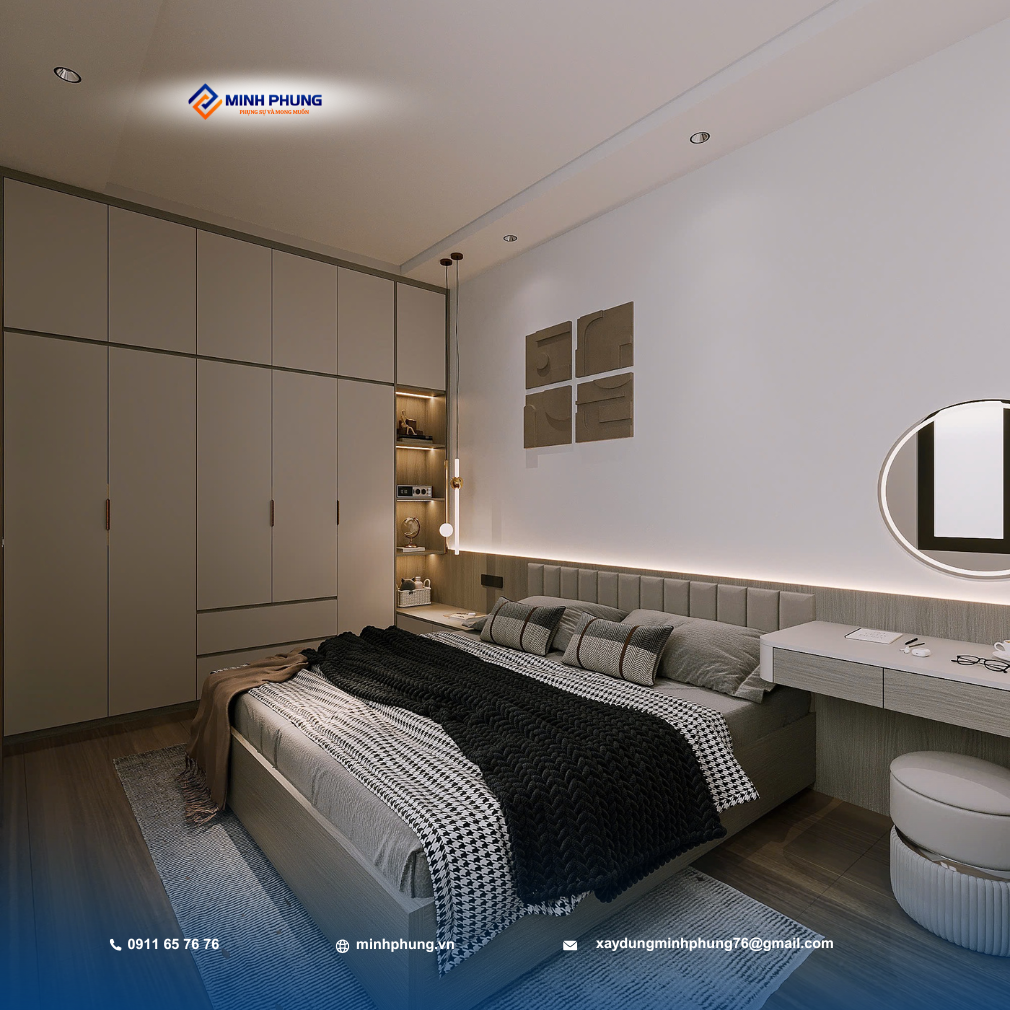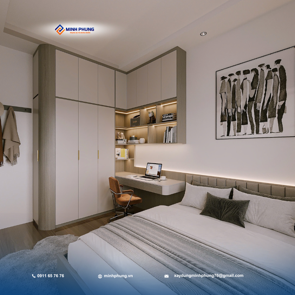 • Phòng Ngủ: Thiết kế tiện nghi, tối đa hóa không gian lưu trữ bằng hệ tủ quần áo kịch trần, kết hợp bàn làm việc/học tập tinh gọn, mang lại sự thoải mái và riêng tư tuyệt đối.
