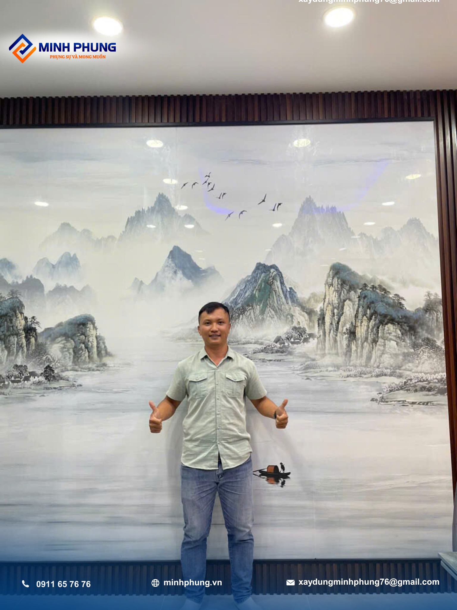 Một chi tiết đặc biệt tạo nên giá trị tinh thần cho ngôi nhà chính là bức tranh phong thủy lớn được treo trang trọng trong không gian sinh hoạt chung, đúng như hình ảnh thực tế công trình. Tranh mang hình ảnh sơn thủy hữu tình, núi non trùng điệp và đàn chim bay lượn, tượng trưng cho sự vững vàng, tài lộc và thịnh vượng.