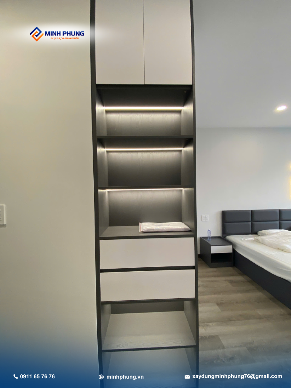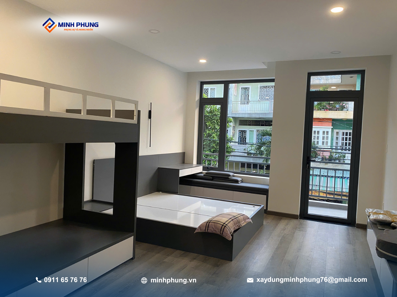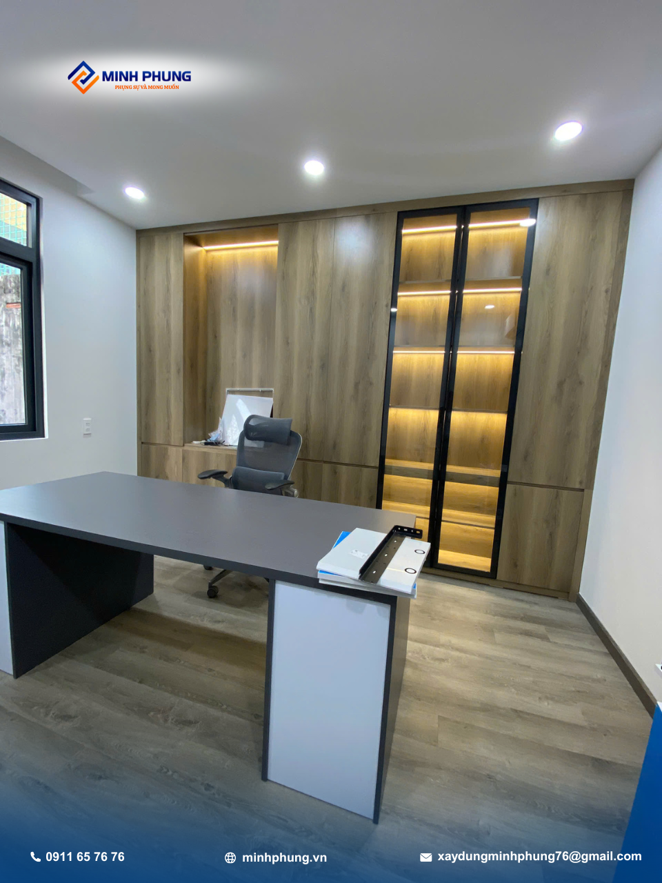 Việc tích hợp không gian làm việc vào mô hình nhà 1 trệt 2 lầu cho thấy sự linh hoạt trong tư duy thiết kế và thi công của Minh Phụng, đáp ứng đúng nhu cầu sống – làm việc tại nhà ngày càng phổ biến hiện nay.