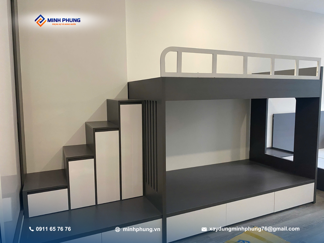 - Phòng ngủ của con được thiết kế giường tầng kiểu thiếu nhi, màu sắc sinh động, an toàn và tiện lợi
