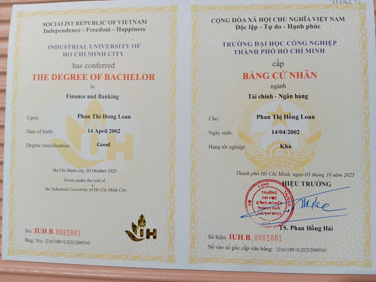 Chị Loan tốt nghiệp trường Đại Học Công Nghiệp TPHCM