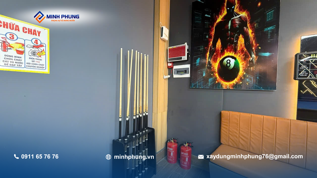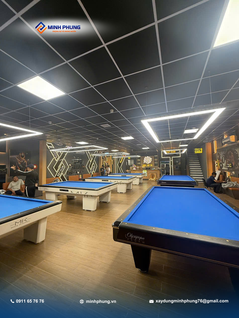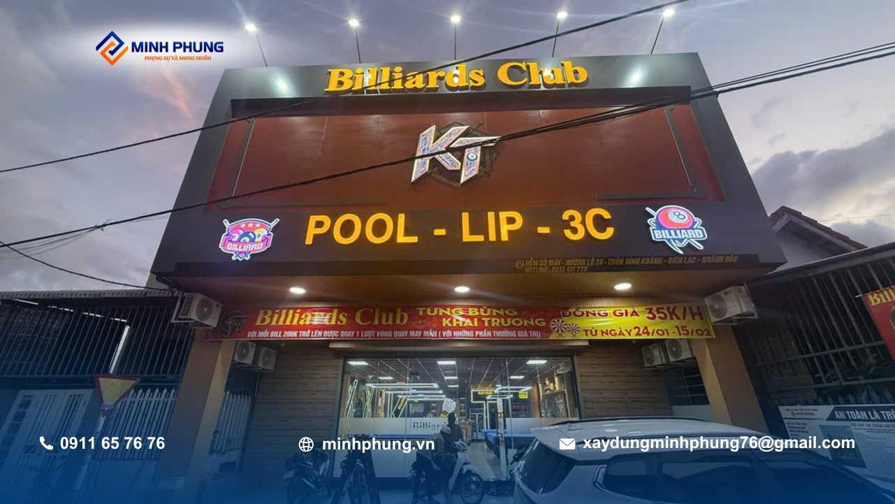 Khác với các công trình nhà phố quen thuộc, đây là dự án kinh doanh dịch vụ giải trí quy mô lớn, thể hiện sự đa dạng của Minh Phụng khi không chỉ nhận nhà ở mà còn thực hiện xây dựng câu lạc bộ bida chuyên nghiệp theo tiêu chuẩn kinh doanh hiện đại.