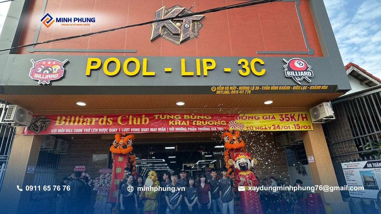 Dự án Câu lạc bộ Bida K&T của anh Khoa tại Nha Trang đã chính thức hoàn thành và bàn giao trong không khí hân hoan của buổi tiệc khai trương linh đình. Tiếng trống lân vang dội, khách mời tham dự đông kín cả hai tầng, đánh dấu một cột mốc quan trọng không chỉ với anh Khoa mà còn với Minh Phụng – đơn vị thi công dự án.