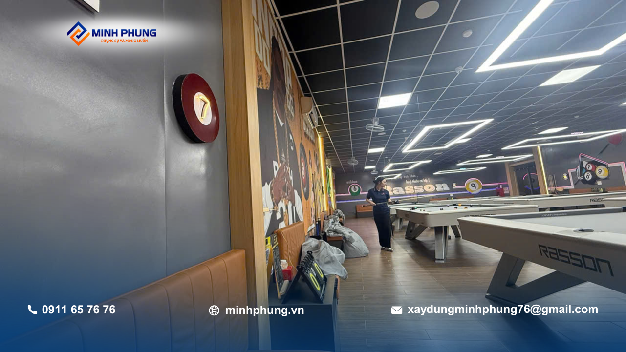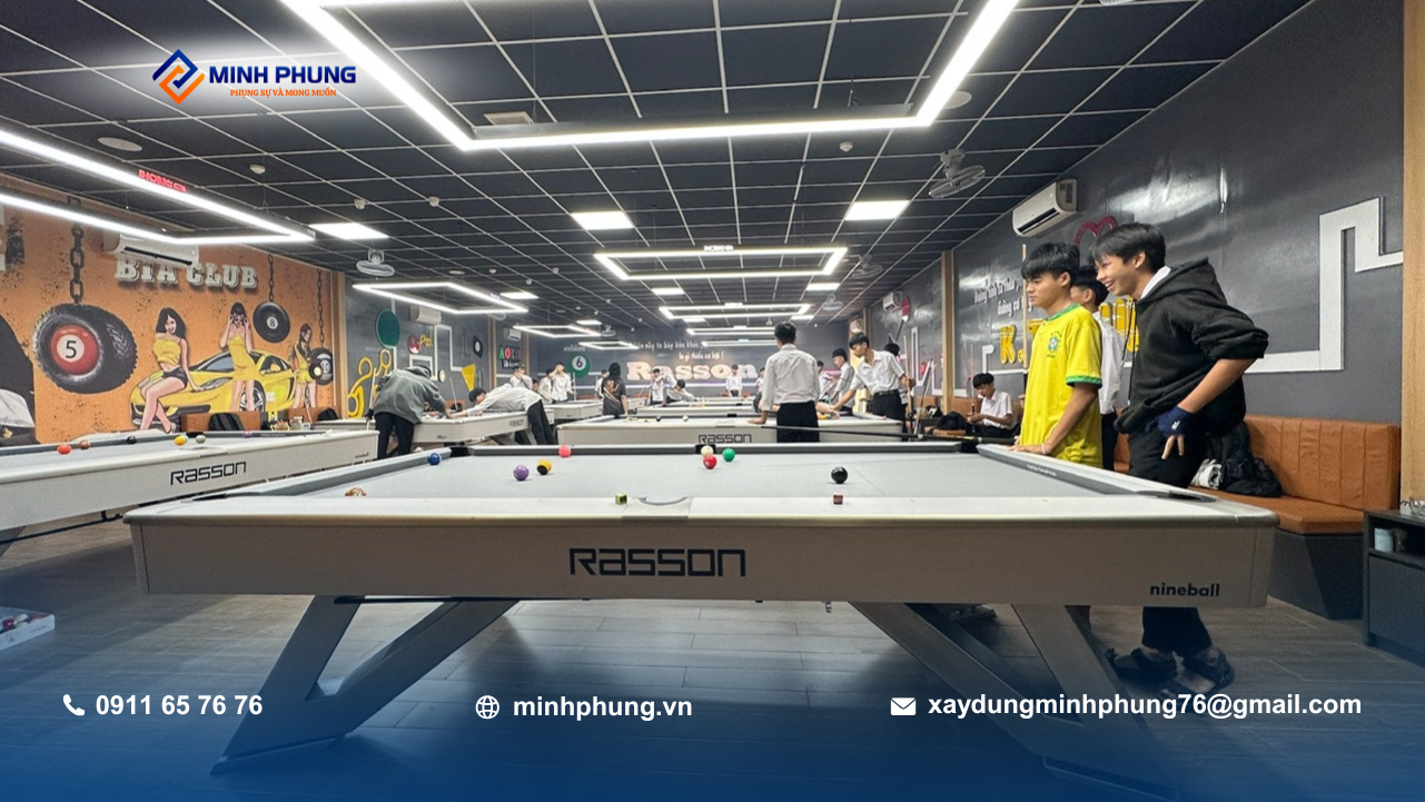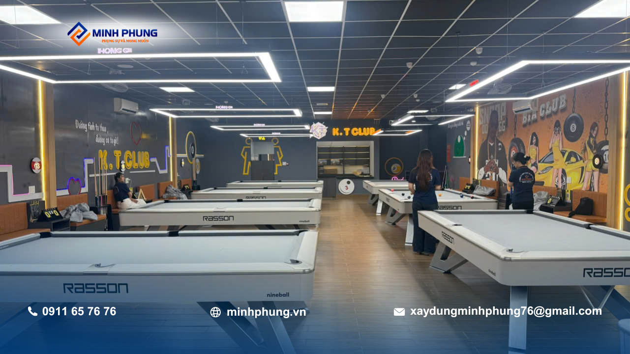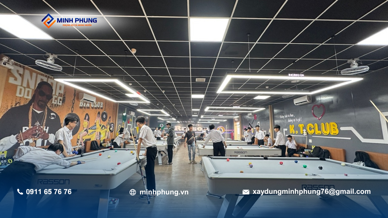 Trong các dự án xây dựng câu lạc bộ bida, việc đảm bảo ánh sáng và độ cao trần là yếu tố sống còn – Minh Phụng đã xử lý đúng kỹ thuật ngay từ khâu kết cấu.