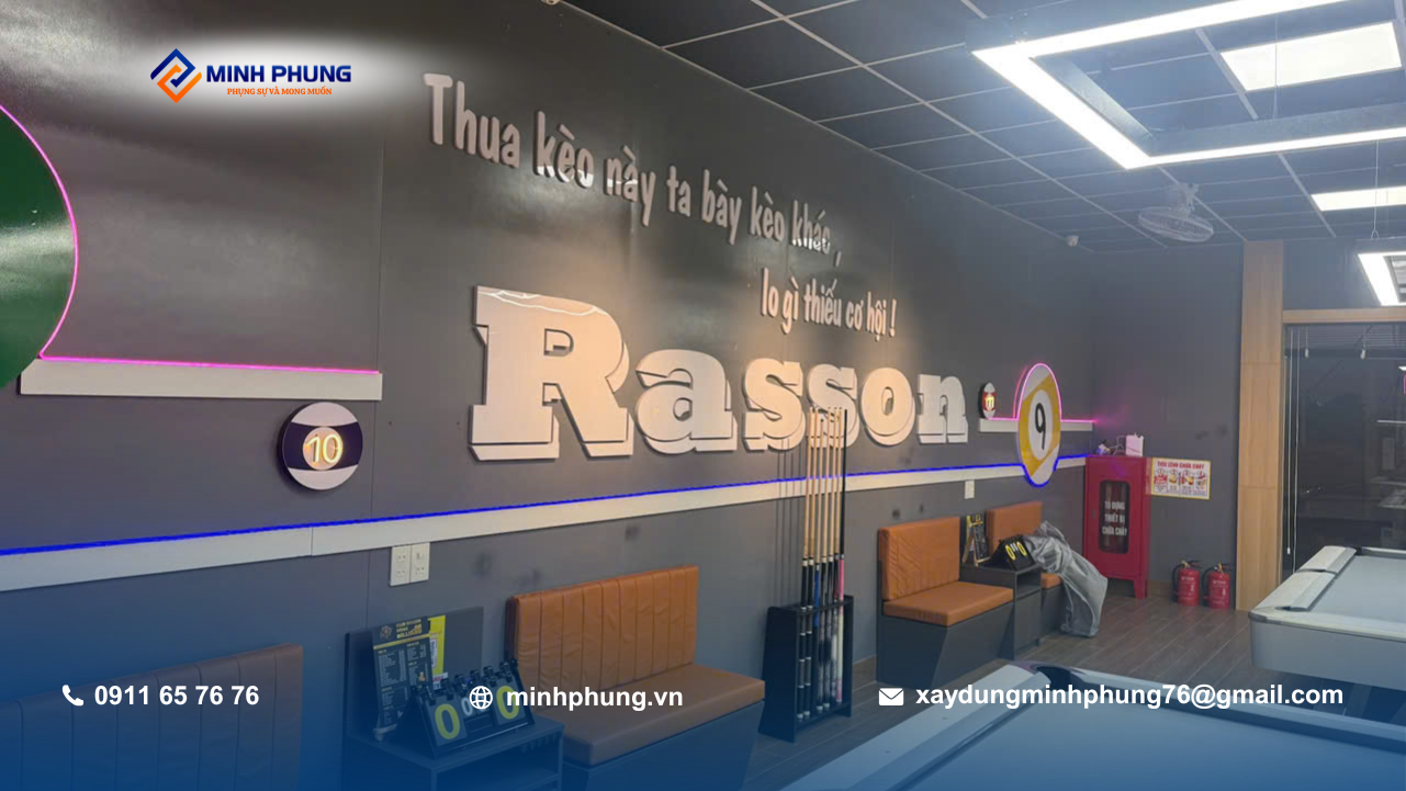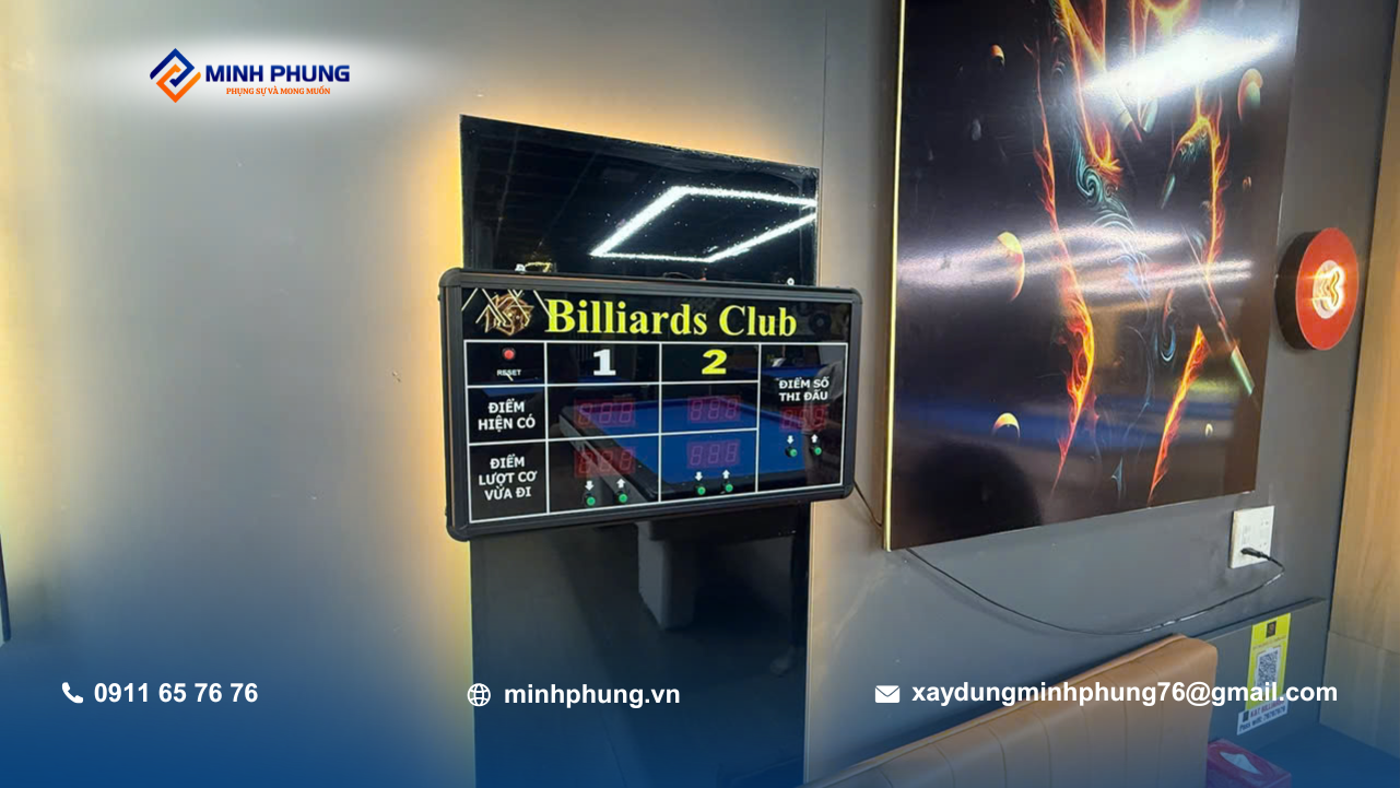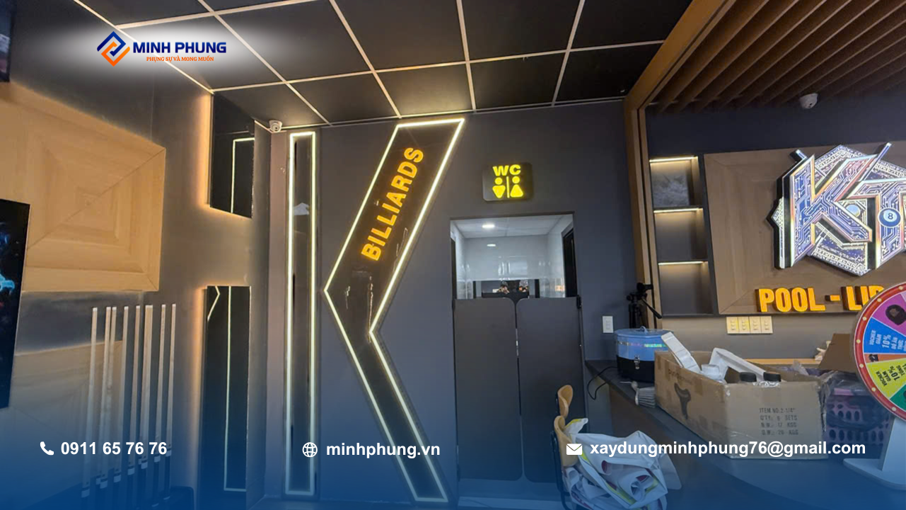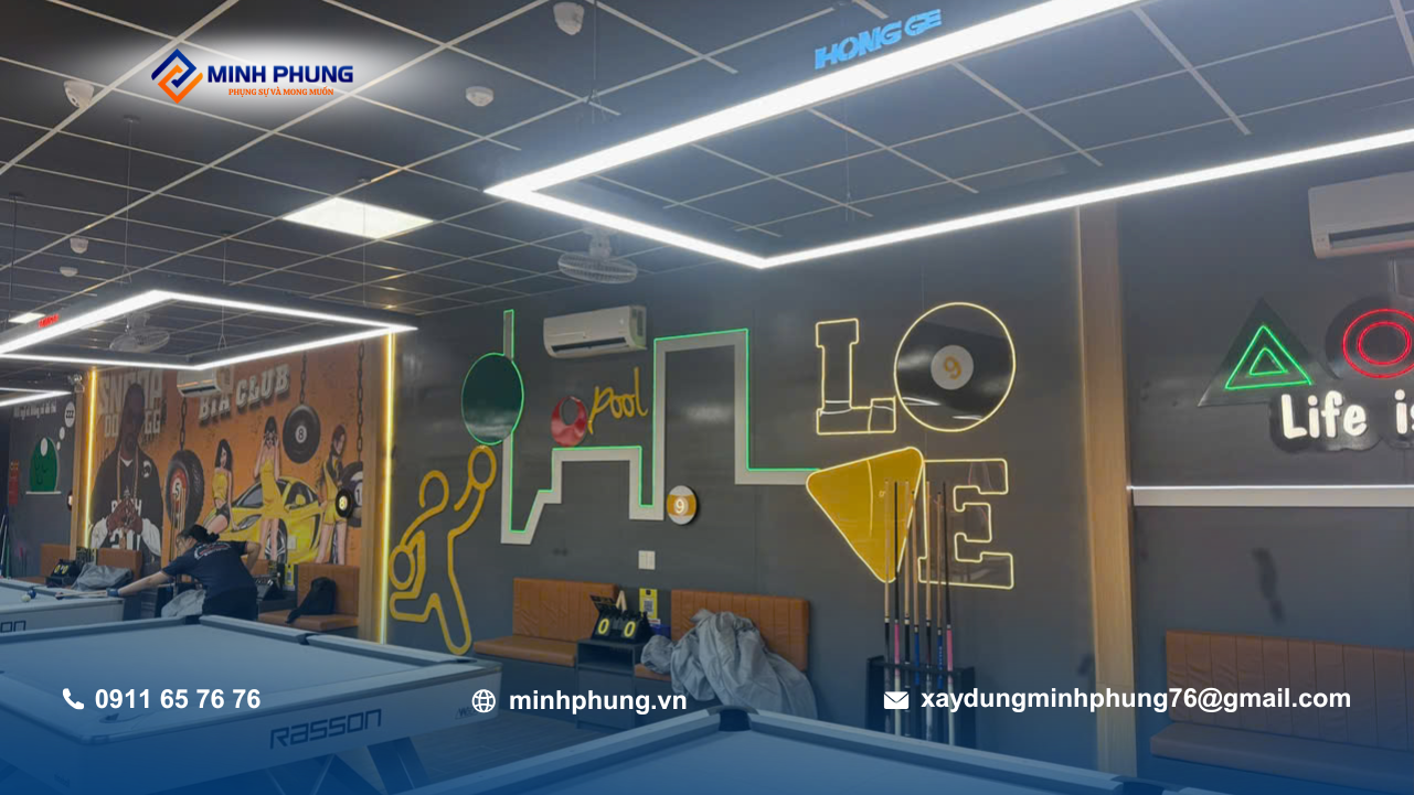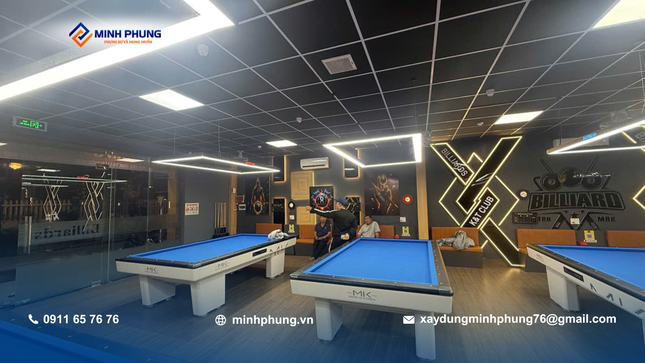 Trong các dự án xây dựng câu lạc bộ bida, việc đảm bảo ánh sáng và độ cao trần là yếu tố sống còn – Minh Phụng đã xử lý đúng kỹ thuật ngay từ khâu kết cấu.